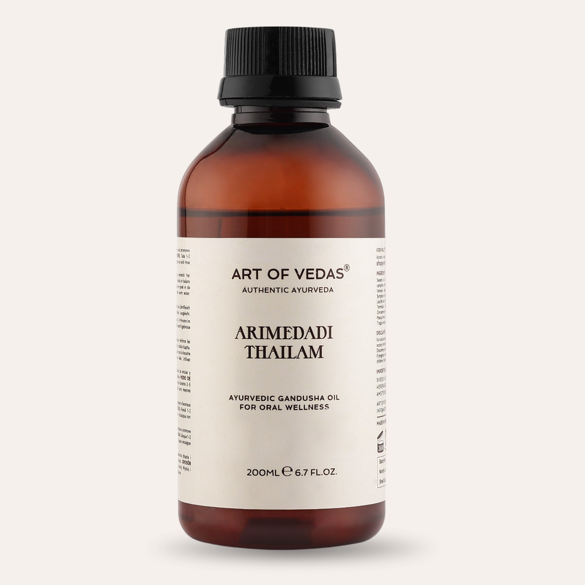 Art of Vedas Arimedadi Thailam, een premium Ayurvedische formule bereid voor de voordelen buiten mondverzorging. Deze kruidige olie helpt bij het verzachten van ontstekingen en pijn in verschillende delen van het lichaam, biedt een kalmerend effect op de geest en verbetert het algehele welzijn.